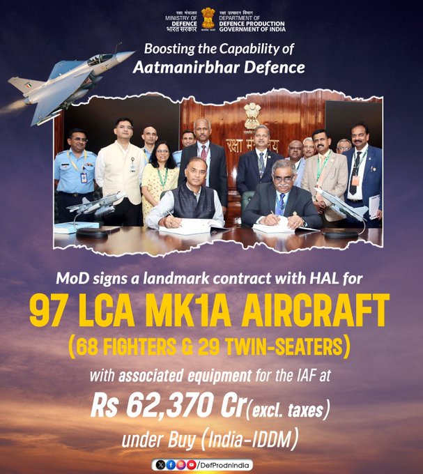 નવી દિલ્હી: ‘આત્મનિર્ભર ભારત’ની પહેલને વેગ આપવા માટે ભારતીય વાયુસેનાએ એક મોટું પગલું ભર્યું છે. તાજેતરમાં સંરક્ષણ મંત્રાલયે HAL સાથે રૂ. 62,370 કરોડના એક મોટા કરાર પર હસ્તાક્ષર કર્યા હતા. આ કરાર હેઠળ ભારતીય વાયુસેનાને કુલ 97 તેજસ Mk1A વિમાન મળશે. આ કરાર હેઠળ પહેલા તેજસ Mk1A ફાઇટર એરક્રાફ્ટને HAL ઓક્ટોબર 2025માં વાયુસેનાને આપવા જઈ રહ્યું છે. પહેલું તેજસ Mk1A ફાઇટર એરક્રાફ્ટ કઈ તારીખે મળશે, આવો જાણીએ.
