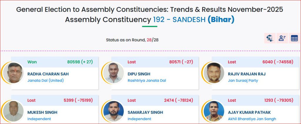 સંદેશ (ભોજપુર): જેડીયુના રાધા ચરણએ આરજેડીના દીપુ સિંહમાત્ર 27 વોટથી હરાવ્યા હતા. આ બેઠક પર 4160 લોકોએ નોટાને મત આપ્યો હતો.