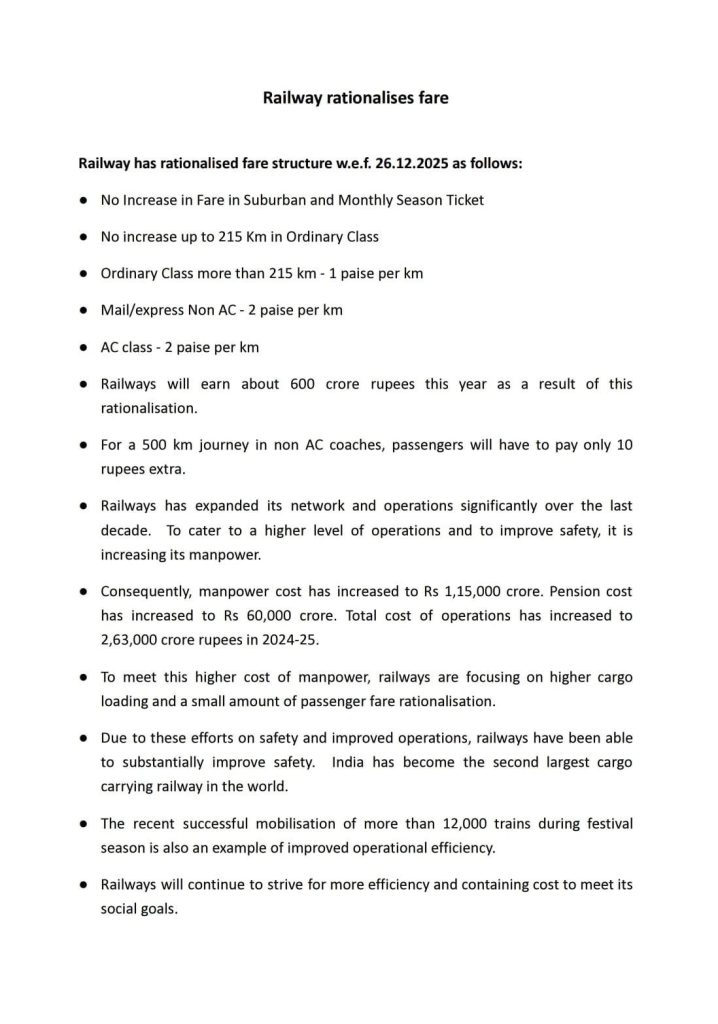 નાણાકીય વર્ષ 2024-25માં રેલવેની કામગીરનો ખર્ચ લગભગ 2.63 લાખ કરોડ રૂપિયા સુધી પહોંચી ગયો છે. આ વધતા ખર્ચને બેલેન્સ કરવા માટે રેલવે યાત્રી ભાડામાં આ નાનકડો વધારો કરવા જઈ રહ્યું છે. ભારતીય રેલવે દ્વારા જાહેર કરવામાં આવેલા નોટિફિકેશન મુજબ આ વધારો 26 ડિસેમ્બર, 2025થી અમલમાં આવશે.
