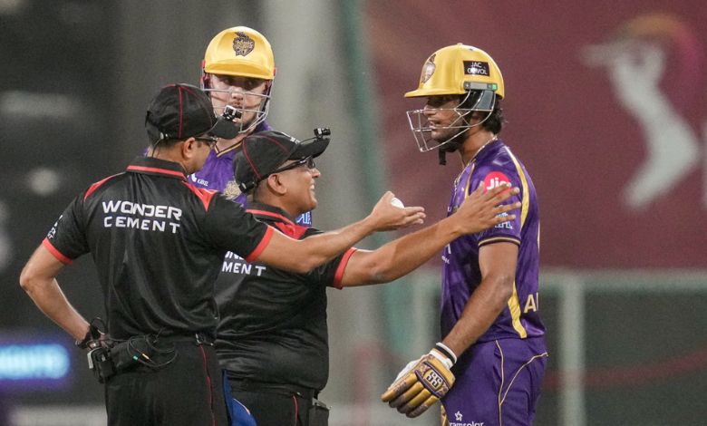 કોલકાતાની ત્રીજી વિકેટ અંગક્રિશ રઘુવંશીની હતી જેને `ઑબ્સ્ટ્રક્ટિંગ ધ બૉલ'ની અપીલમાં અમ્પાયરે આઉટ આપ્યો હતો. પેસ બોલર પ્રિન્સ યાદવની એક ઓવરમાં રઘુવંશીએ બૉલને મિડ-ઑન તરફ ધકેલ્યો અને રન લેવા દોડ્યો ત્યારે કૅમેરન ગ્રીને તેને પાછો મોકલ્યો હતો. જોકે રઘુવંશી ડાઇવ મારીને ક્રીઝમાં પાછો આવી રહ્યો હતો ત્યારે તે તેના સ્ટમ્પ્સ પર થ્રો કરનાર મોહમ્મદ શમી માટે વિઘ્ન બન્યો હતો. શમીનો બૉલ રઘુવંશીના શરીરને વાગ્યો હતો. રઘુવંશીએ શમીના થ્રોમાં બૉલ સ્ટમ્પ્સમાં જતો રોકવાનો પ્રયાસ કર્યો એવી ખુદ શમી અને લખનઊની ટીમની અપીલને પગલે રઘુવંશીએ દલીલો કરી હતી, પરંતુ થર્ડ અમ્પાયર રોનક પંડિતે રઘુવંશીને આઉટ જાહેર કર્યો હતો. રઘુવંશીએ ગુસ્સામાં પોતાની હેલ્મેટ નીચે પછાડી હતી. કોલકાતાનો હેડ-કોચ અભિષેક નાયર ફોર્થ અમ્પાયર સાથે દલીલ કરતો જોવા મળ્યો હતો. કૅમેરન ગ્રીન (ત્રણ સિક્સરની મદદથી 34 રન)ને બાદ કરતા આઉટ થયેલા રહાણે, સિફર્ટ, રઘુવંશી, પૉવેલ સહિત કોલકાતાના બીજા પાંચમાંથી એકેય ખેલાડી 10 રનનો આંકડો પણ નહોતો વટાવી શક્યો.