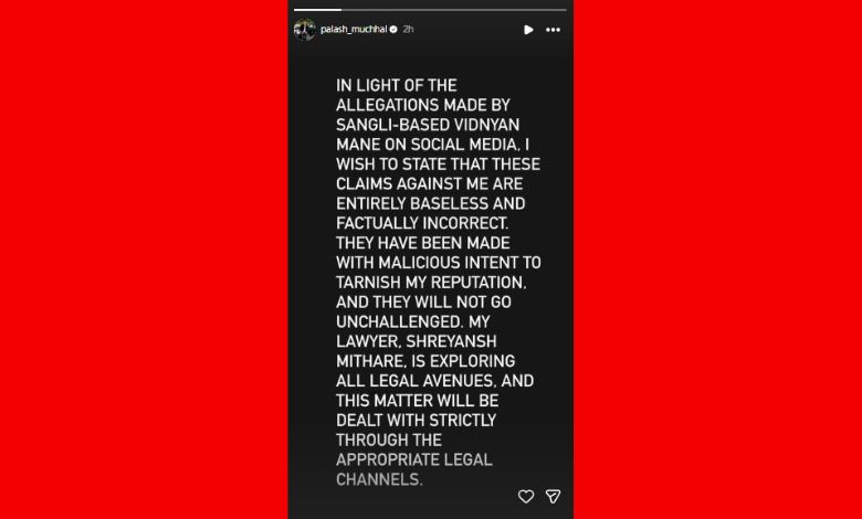 પલાશ મુચ્છલે પોતાની સામે કરવામાં આક્ષેપો પર મૌન તોડ્યું છે. પલાશે સોશિયલ મીડિયા પર સ્ટોરી શેર કરીને આ બાબતે સ્પષ્ટતા કરી છે. તેણે પોતાની સ્ટોરીમાં લખ્યું છે કે વિજ્ઞાન માને દ્વારા મારા પર લગાવવામાં આવેલા તમામ આક્ષેપો ખોટા અને પાયાવિહોણા છે. મારા માટે જે પણ વાતો થઈ રહી છે તેમાં બિલકુલ સચ્ચાઈ નથી. આ બધી વસ્તુઓ મારી આબરૂના ધજાગરા ઉડાવવા માટે કહેવાઈ રહી છે અને હું આ લોકોને છોડીશ નહીં. મારા વકીલે આ મામલે એક્શન લેવાનું શરૂ કરી દીધું છે અને આ મુદ્દાને ખૂબ જ ગંભીરતાથી લેવામાં આવશે.