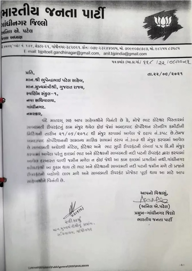 આ ઉપરાંત સૂત્રોએ જણાવ્યું કે, ભૂમાફિયાઓના પાપે વડા પ્રધાન નરેન્દ્ર મોદીનો સાબરમતી રિવરફ્રન્ટનો ડ્રીમ પ્રોજેક્ટ લટકી પડ્યો હતો. બીજા તબક્કાનું કામ શરુ થયા બાદ પણ સાબરમતીના કાંઠે આવેલા મોટેરા, કોટેશ્વર અને ભાટ ગામની સીમમાં નદી કિનારાની કેટલીક જમીનનો કબજો સાબરમતી રિવરફ્રન્ટ ઓથોરિટીને સોંપાતો નહોતો. રિવરફ્રન્ટનું કામ ઝડપથી આગળ વધે એ માટે ભાજપના જ ધારાસભ્ય અને નેતાઓએ મુખ્યમંત્રીની માંડીને વડાપ્રધાન સુધી લેખિતમાં રજૂઆતો કરી હતી. આ રજૂઆત કરનારામાં ગાંધીનગર જિલ્લાના તત્કાલીન ભાજપ પ્રમુખ અનિલ પટેલ, ગાંધીનગરના પૂર્વ ધારાસભ્ય શંભુજી ઠાકોર, ગાંધીનગર ભાજપના પૂર્વ પ્રમુખ રુચિર ભટ્ટ, ગાંધીનગર મહાપાલિકાના પૂર્વ કોર્પોરેટર માણેકજી ઠાકોર, તેજલબેન નાયી, સેજલબેન પરમારનો સમાવેશ થાય છે.