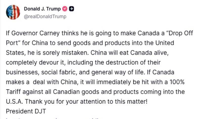 અમેરિકી રાષ્ટ્રપતિએ માત્ર આર્થિક જ નહીં, પરંતુ કેનેડાના સામાજિક તાણાવાણા પર પણ ખતરો હોવાનું જણાવ્યું છે. ટ્રમ્પના મતે, ચીન સાથેની વ્યાપારિક સમજૂતીથી કેનેડાની જીવનશૈલી અને વ્યવસાયિક માળખું સંપૂર્ણપણે નાશ પામશે. તેમણે કેનેડાને ચેતવતા કહ્યું છે કે જો ચીન સાથે કોઈ પણ પ્રકારની ડીલ કરવામાં આવશે, તો અમેરિકા કેનેડાથી આવતી તમામ ચીજવસ્તુઓ પર તાત્કાલિક અસરથી 100 ટકા ટેરિફ (કર) ઝીંકી દેશે. આ એક પ્રકારની આર્થિક નાકાબંધીની ચીમકી છે જે કેનેડા માટે મુશ્કેલી સર્જી શકે છે.