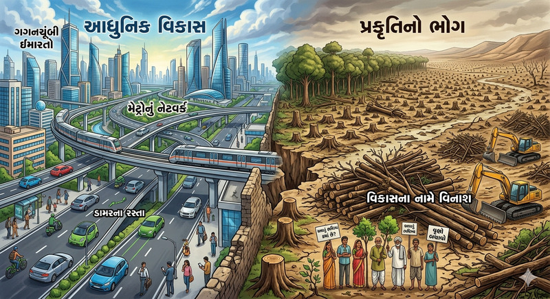 આપણે ગગનચૂંબી ઈમારતો, ડામરના રસ્તા અને મેટ્રોના નેટવર્કને વિકાસ માની લીધો છે. પરંતુ આ વિકાસના નામે લાખો વૃક્ષોનો ભોગ લોવાઈ રહ્યો છે, 'ગ્રીન કવર' સતત ઘટી રહ્યું છે. સિમેન્ટના જંગલો સૂર્યની ગરમીને શોષીને શહેરોને ભઠ્ઠી બનાવી રહ્યા છે. આપણે એ ભૂલી રહ્યા છીએ કે જે એસી રૂમમાં બેસીને આપણે ઠંડક અનુભવીએ છીએ, એ જ એસી બહારના પર્યાવરણને વધુ ઝેરી અને ગરમ બનાવી રહ્યું છે.