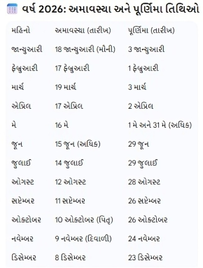 ગણતરીના દિવસમાં વર્ષ 2025નું પૂર્ણ થશે અને વર્ષ 2026નો પ્રારંભ થશે. ત્યારે હિન્દું ધર્મમાં વાર તિથી અને તહેવારનું અનેરું મહત્વ હોઈ છે. જેમાં અમાસ અને પૂનમ મહત્વની બે તિથી હોઈ છે.