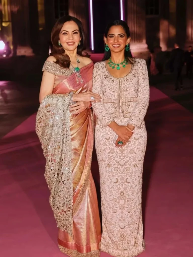 આ કાર્યક્રમ માટે નીતા અંબાણીએ આર. વર્ધન દ્વારા ડિઝાઇન કરાયેલ સ્વદેશી બ્રાન્ડની સિલ્ક કાંજીવરમ સાડી પસંદ કરી. આ સાડી સનસેટ શેડ એટલે કે બેબી પિંક અને કોપરના શેડમાં છે.