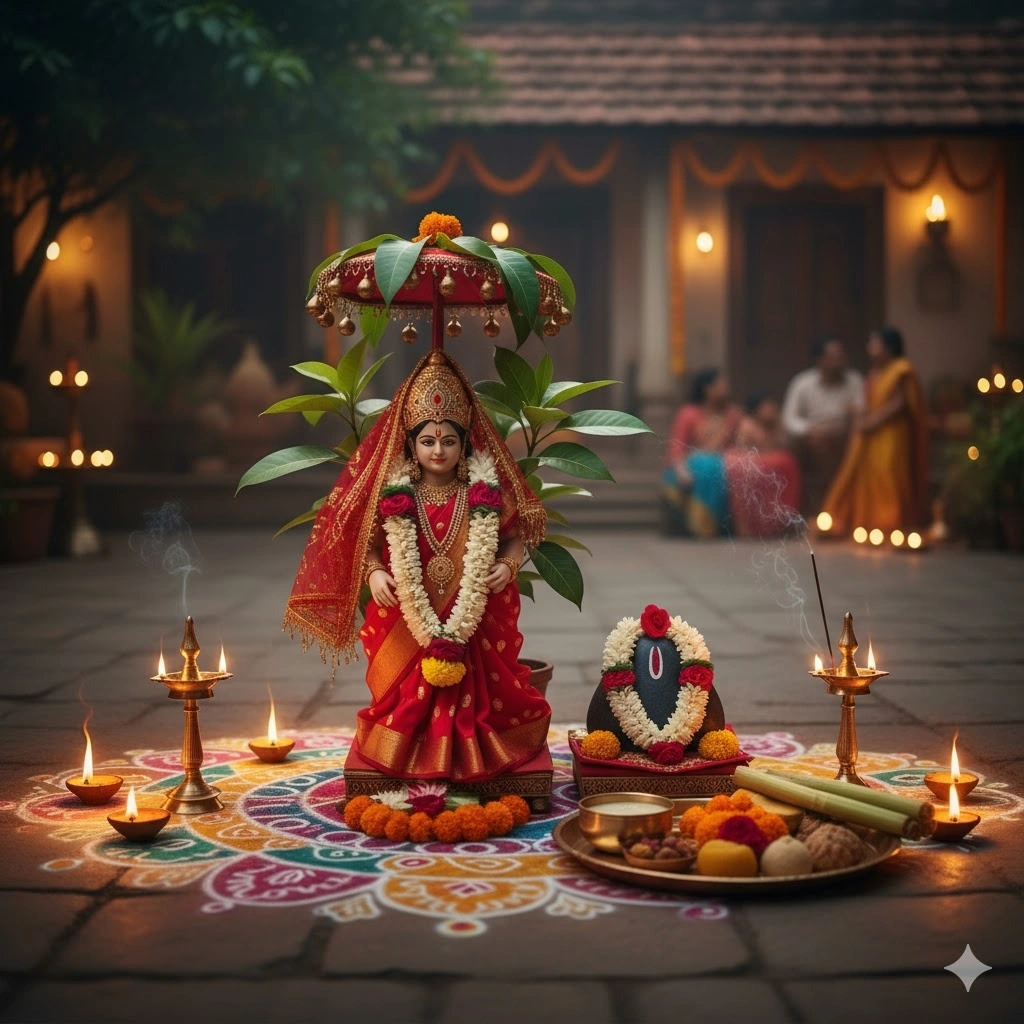 ઘરના આંગણે કે પૂજા સ્થળે તુલસીનો છોડ મૂકીને રંગોળીથી મંડપ સજાવો. તુલસી માતાને બંગળી, ચુંદડી, સાડી અને શૃંગાર સામગ્રી અર્પણ કરો. શાલિગ્રામને તુલસીની જમણી બાજુએ સ્થાપિત કરીને ગંગાજળથી સ્નાન કરાવો.
