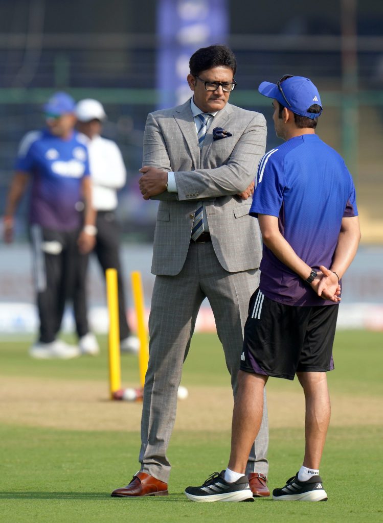 ટીમ ઇન્ડિયાના ભૂતપૂર્વ હેડ-કોચ અનિલ કુંબલેએ શનિવારે દિલ્હીના મેદાન પર વર્તમાન હેડ-કોચ ગૌતમ ગંભીર સાથે ઘણી વાતચીત કરી હતી. કુંબલેએ 1999માં આ જ મેદાન પર પાકિસ્તાન સામેની ટેસ્ટના એક જ દાવમાં તમામ 10 વિકેટની મહાન સિદ્ધિ મેળવી હતી. શુક્રવારે ટેસ્ટના આરંભ પહેલાં કુંબલેને બેલ વગાડવાનું સૌભાગ્ય મળ્યું હતું. (પીટીઆઇ)