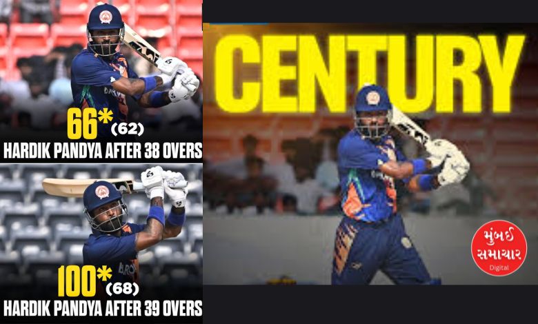 વિદર્ભ (Vidarbh)એ એક સમયે 71 રનમાં બરોડાની પાંચ વિકેટ લઈને એને મુસીબતમાં મૂકી દીધું હતું અને 31મી ઓવરમાં બરોડાએ 136 રનના સ્કોર પર કૅપ્ટન કૃણાલ પંડ્યાની છઠ્ઠી વિકેટ પણ ગુમાવી હતી, પરંતુ આ વન-ડે ટૂર્નામેન્ટમાં પહેલી વાર રમી રમીને સાતમા ક્રમે બૅટિંગમાં મોકલવામાં આવેલા હાર્દિકે બાજી સંભાળી લીધી હતી અને કેટલીક નાની ભાગીદારીની મદદથી ટીમને સધ્ધર સ્થિતિમાં લાવી દીધી હતી.