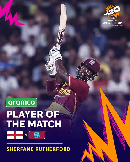 મુંબઈઃ વાનખેડે સ્ટેડિયમમાં બુધવારે વેસ્ટ ઇન્ડિઝે (20 ઓવરમાં 6/196) ઇંગ્લૅન્ડ (19 ઓવરમાં 10/166)ને 30 રનથી હરાવીને ચાર પૉઇન્ટ સાથે ગ્રૂપ-સીમાં મોખરે સ્થાન મજબૂત કર્યું હતું. બૅટિંગમાં શેરફેન રુધરફર્ડ (76 અણનમ, 42 બૉલ, સાત સિક્સર, બે ફોર)એ ધબધબાટી બોલાવી હતી અને પછી બોલિંગમાં સ્પિનર્સે બ્રિટિશરોને જાળમાં ફસાવ્યા હતા.