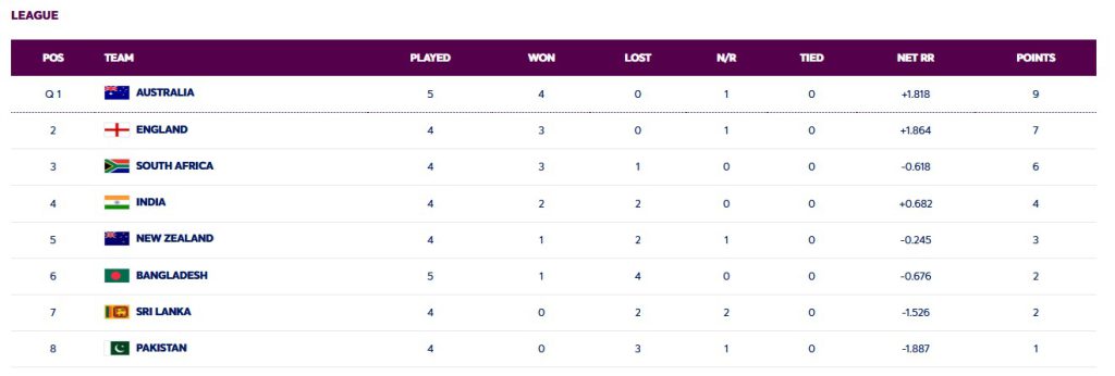 ટુર્નામેન્ટના પોઈન્ટ ટેબલમાં ભારતીય મહિલા ટીમ 4પોઈન્ટ્સ સાથે ચોથા સ્થાને છે,ભારતીય ટીમે 4 માંથી 2માં જીત મેળવી છે અને 2માં હાર મળી છે. પોઈન્ટ ટેબલમાં ઓસ્ટ્રેલીયા બાદ બીજા ક્રમે ઈંગ્લેન્ડની ટીમ છે, બાકીની ત્રણ મેચોમાંથી એક જીત જીતવાની સાથે તે સેમિફાઇનલમાં પ્રવેશ મેળવશે. ત્રીજા સ્થાને રહેલા દક્ષિણ આફ્રિકાની ટીમ છે, તેણે અત્યાર સુધી ચારમાંથી ત્રણમાં જીત મેળવી છે.