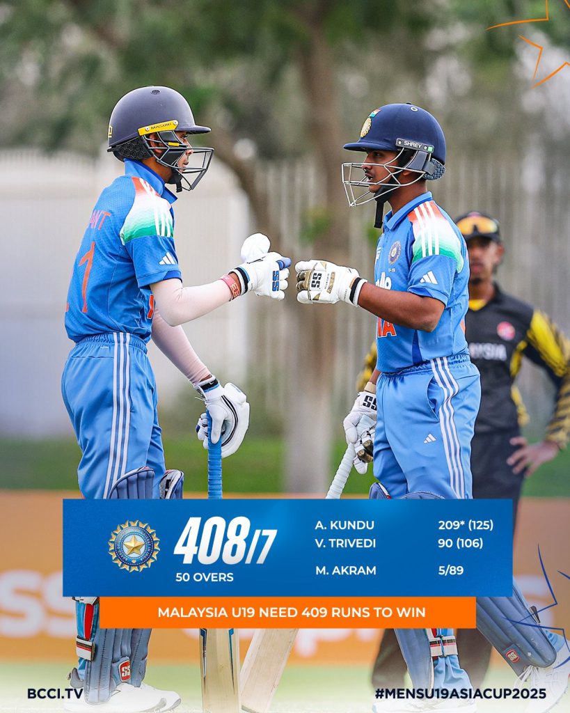 દુબઈમાં ભારતને 7/408નું તોતિંગ ટોટલ અપાવવામાં અમદાવાદના 18 વર્ષીય વેદાંત ત્રિવેદી (90 રન, 106 બૉલ, સાત ફોર) અને 14 વર્ષના વૈભવ સૂર્યવંશી (50 રન, 26 બૉલ, ત્રણ સિક્સર, પાંચ ફોર)ના પણ મહત્ત્વના યોગદાન હતા. વૈભવની વિકેટ મલયેશિયાના મુહમ્મદ અકરમે લીધી હતી, જ્યારે વેદાંતની વિકેટ ભારતીય મૂળના બોલર જાશ્વીન ક્રિષ્નમૂર્તિએ લીધી હતી. ખરેખર તો મુહમ્મદ અકરમે કુલ પાંચ વિકેટ લીધી હતી.