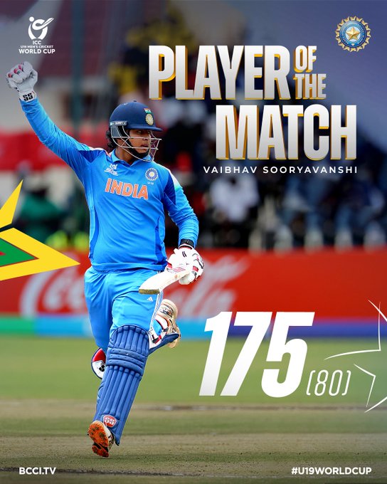 જો વૈભવ સૂર્યવંશી ક્રીઝ પર વધુ ટક્યો હોત તો ભારતે કદાચ 500 રન પણ બનાવી લીધા હોત. કૅપ્ટન આયુષ મ્હાત્રે (53 રન, 51 બૉલ, બે સિક્સર, સાત ફોર), અભિજ્ઞાન કુન્ડુએ (40 રન, 31 બૉલ, એક સિક્સર, છ ફોર), કનિષ્ક ચૌહાણ (અણનમ 37 રન, 20 બૉલ, એક સિક્સર, ત્રણ ફોર), વેદાંત ત્રિવેદી (32 રન, 36 બૉલ, ત્રણ ફોર) અને વિહાન મલ્હોત્રા (30 રન, 36 બૉલ, બે ફોર)ના પણ ભારતના 9/411ના સ્કોરમાં મહત્ત્વના યોગદાન હતા.