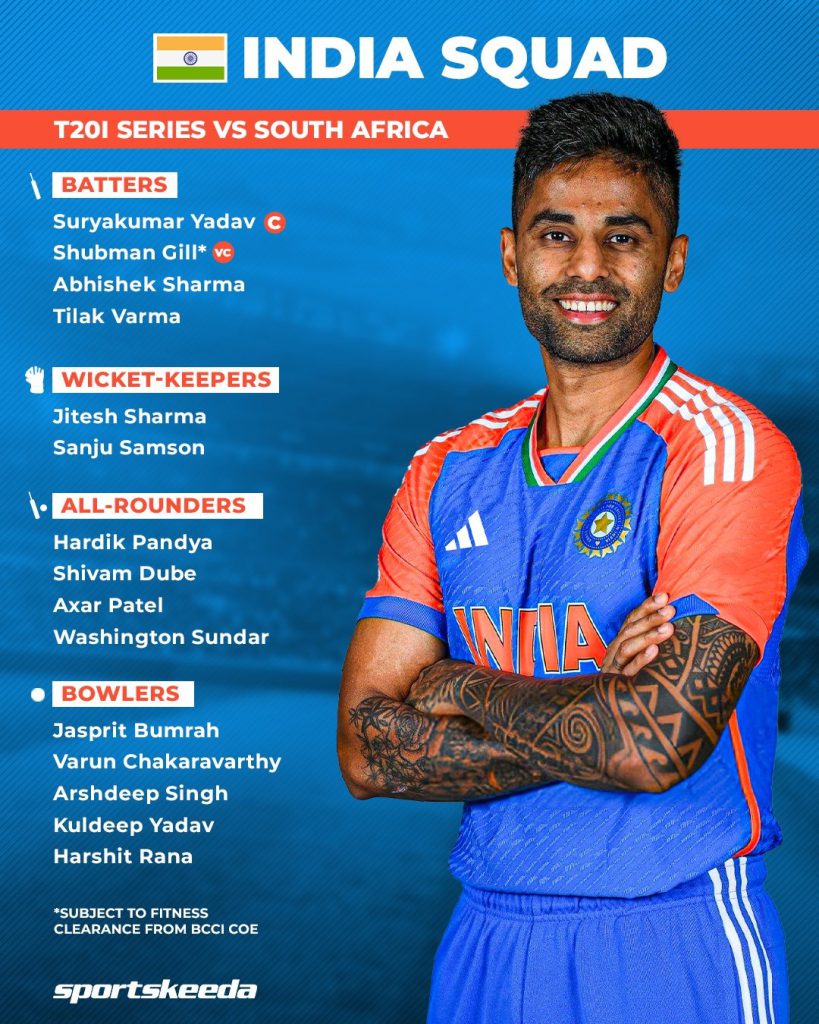સૂર્યકુમાર યાદવના સુકાનમાં ભારતીય ટી-20 ટીમ 9-19 ડિસેમ્બર દરમ્યાન સાઉથ આફ્રિકા (South Africa) સામે પાંચ ટી-20 રમશે. ગિલને ટીમમાં વાઇસ-કૅપ્ટન તરીકે સમાવવામાં આવ્યો છે, પરંતુ ગરદનની ઈજા બાબતમાં તેને બીસીસીઆઇ (BCCI) તરફથી લીલી ઝંડી મળશે (ફિટ હોવા વિશેનું સર્ટિફિકેટ મળશે તો જ) તેને આ શ્રેણીમાં રમવા મળશે. તાજેતરમાં ઑસ્ટ્રેલિયા ખાતેના પ્રવાસ માટેની ટી-20 ટીમમાં રિન્કુ અને નીતીશનો સમાવેશ હતો, પરંતુ હવે જાહેર કરાયેલી ટીમમાં તેમના નામ નથી.
