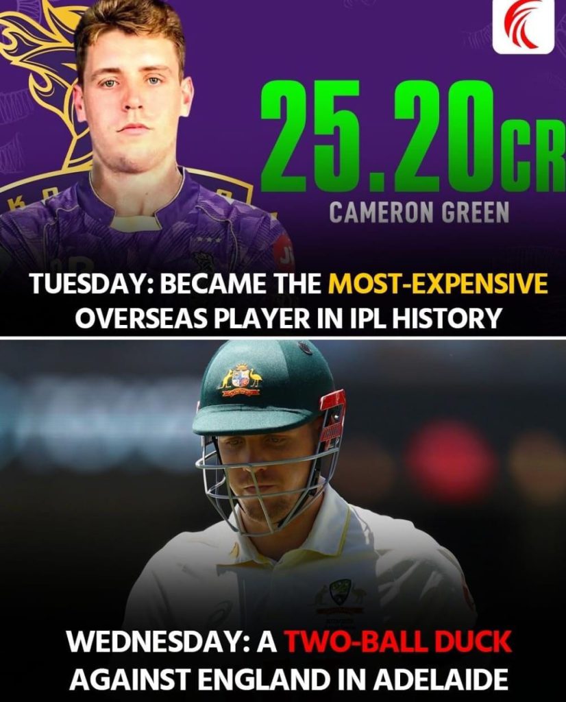 એડિલેઇડ: મંગળવારે અબુ ધાબીમાં કોલકાતાએ મિની ઑક્શનમાં ઑસ્ટ્રેલિયાના ઑલરાઉન્ડર કૅમેરન ગ્રીન (Cameron Green)ને 2.00 કરોડ રૂપિયાની મૂળ કિંમત સામે 25.20 કરોડ રૂપિયામાં ખરીદીને તેને આ ટૂર્નામેન્ટનો સૌથી મોંઘો વિદેશી ખેલાડી બનાવ્યો એના પંદર જ કલાકમાં ગ્રીને પોતાના દેશના જ મેદાન પર દાટ વાળ્યો જેમાં તે એશિઝ ટેસ્ટમાં ઇંગ્લેન્ડ સામે શૂન્ય (Zero)માં આઉટ થઈ ગયો હતો.