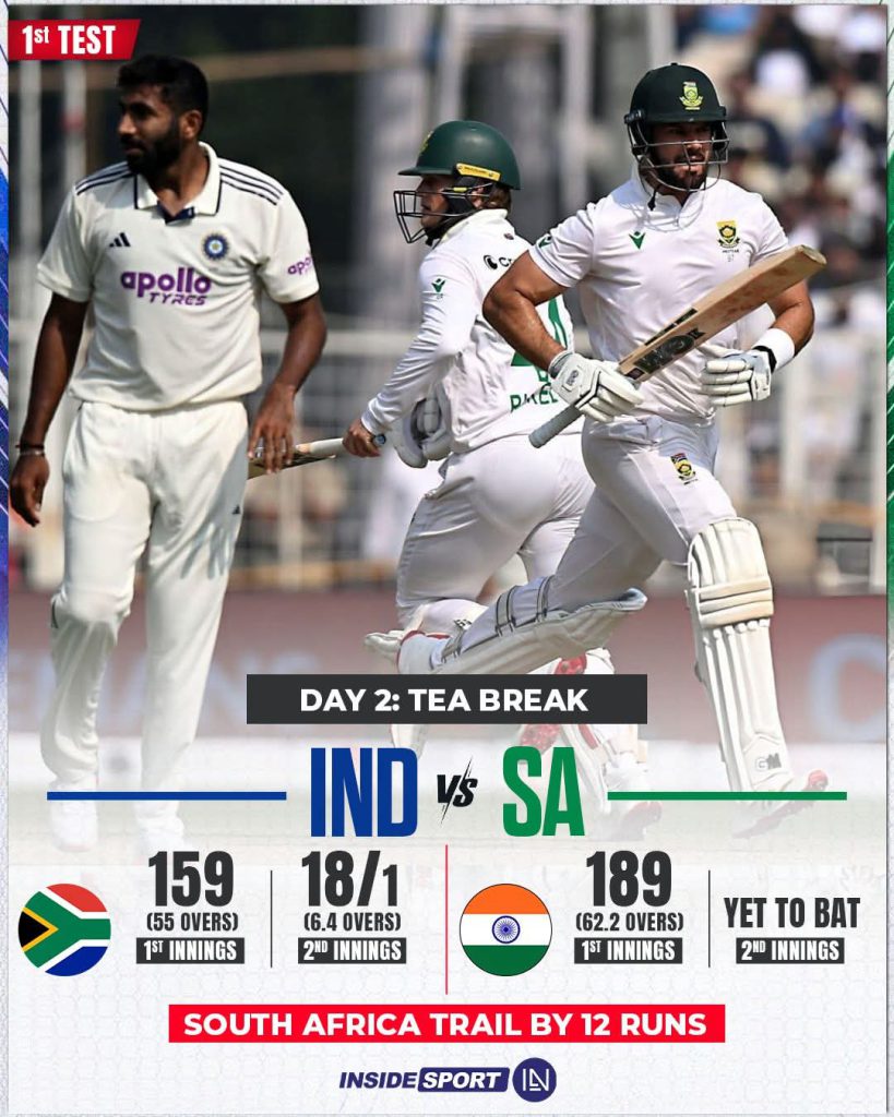 કોલકાતા: ઈડન ગાર્ડન્સ (Eden Gardens)માં પહેલી ટેસ્ટમાં આજે બીજા દિવસે ભારતનો પ્રથમ દાવ 189 રનના સ્કોર પર સમાપ્ત થતાં 30 રનની લીડ મળી હતી અને ત્યાર બાદ સાઉથ આફ્રિકાએ 18 રનમાં એક વિકેટ ગુમાવી હતી.