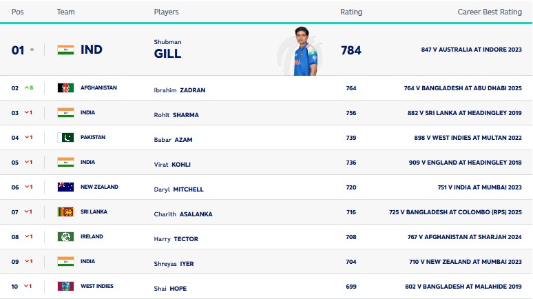 ODI બેટિંગ રેન્કિંગમમાં શુભમન ગીલ પહેલા ક્રમે યથાવત છે, પણ અફઘાનિસ્તાનના ઇબ્રાહિમ ઝદરાને તને ટક્કર આપી રહ્યો છે. ઇબ્રાહિમ એક સાથે આઠ સ્થાનની છલાંગ લગાવીને બીજા સ્થાને પહોંચી ગયો છે.