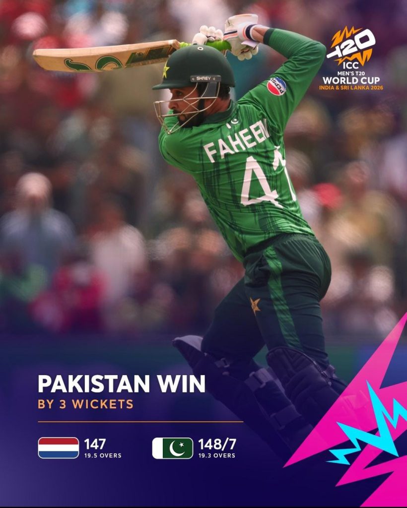 પાકિસ્તાને ત્રણ બૉલ અને ત્રણ વિકેટ બાકી રાખીને 7/148ના સ્કોર સાથે જીત મેળવી હતી. નેધરલેન્ડ્સના પેસ બોલર પૉલ વૅન મીકેરને પણ બે વિકેટ મેળવી હતી.