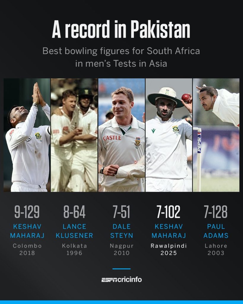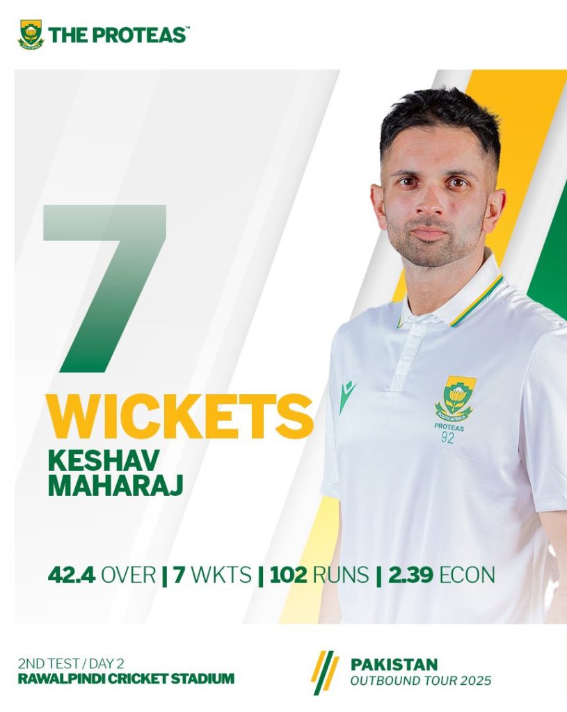 કેશવ આત્માનંદ મહારાજ 35 વર્ષનો છે. તે લેફ્ટ-આર્મ સ્પિનર છે અને તેણે 42.4 ઓવરમાં 102 રનમાં પાકિસ્તાનના સાત બૅટ્સમેનને પૅવિલિનનો રસ્તો બતાડ્યો હતો. તેની મુખ્ય વિકેટોમાં કૅપ્ટન શાન મસૂદ અને ટી-20 ટીમના સુકાની સલમાન આગાની વિકેટોનો સમાવેશ હતો. શાન મસૂદ 87 રનમાં આઉટ થતાં 13 રન માટે સદીથી વંચિત રહ્યો હતો. સલમાન (45 રન) પાંચ રન માટે હાફ સેન્ચુરી ચૂક્યો હતો. 66 રન કરનાર સાઉદ શકીલની વિકેટ પણ મહારાજે જ લીધી હતી.