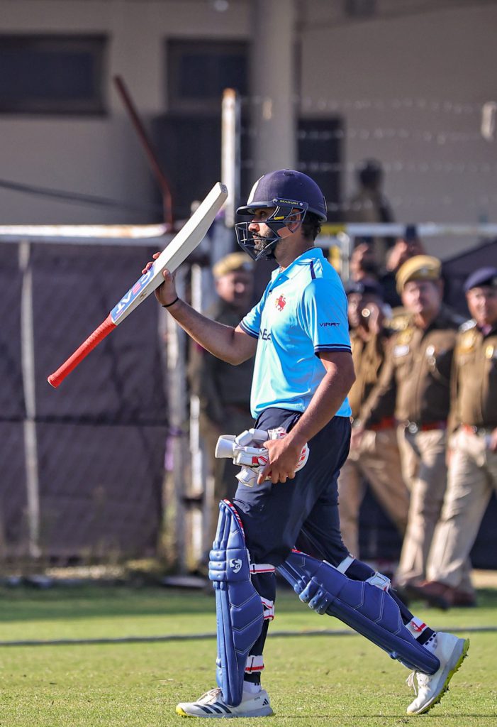 જયપુરઃ સચિન તેન્ડુલકર, મહેન્દ્રસિંહ ધોની અને વિરાટ કોહલી પછી હવે રોહિત શર્માને પણ ભારતીય ક્રિકેટ ચાહકોમાં જાણે ` ભગવાનની પદવી’ મળી રહી હોય એવું લાગે છે. બુધવારે જયપુર (Jaipur)માં વિજય હઝારે ટ્રોફી વન-ડે ટૂર્નામેન્ટમાં સિક્કિમ સામે રોહિત શર્માએ 94 બૉલમાં નવ સિક્સર અને અઢાર ફોરની મદદથી 155 રન કરીને મુંબઈને શાનદાર વિજય અપાવ્યો ત્યાર બાદ મેદાન પર એક બાળક દોડી આવ્યો હતો અને રોહિતને પગે લાગવા ગયો ત્યારે રોહિતે તેને રોક્યો હતો અને તેની પીઠ થાબડીને માનપૂર્વક અને વહાલપૂર્વક તેને પાછો મોકલ્યો હતો.