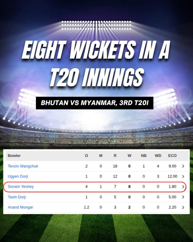 A spell for the ages! Sonam Yeshey’s unbelievable 8/7 in 4 overs goes down as a world record. @ICC #bhutanmyanmarseries #worldrecord pic.twitter.com/kBpmYjr8BH