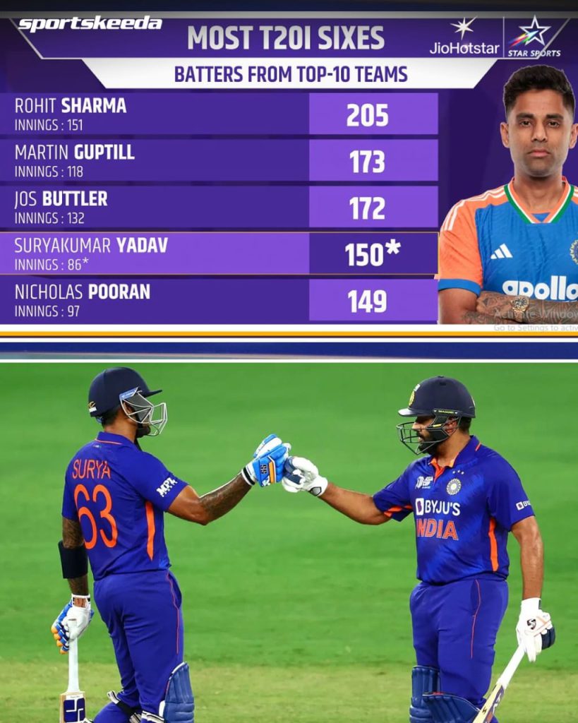 રોહિત શર્મા ટી-20માંથી નિવૃત્તિ લઈ ચૂક્યો છે. જોકે તેની કુલ 205 સિક્સર આ ઇન્ટરનૅશનલ ફૉર્મેટમાં વિશ્વવિક્રમ છે. સૂર્યકુમારે બુધવારની મૅચમાં બે સિક્સર ફટકારી હતી જેમાંની બીજી સિક્સર 150મી હતી. ભારતીયોમાં રોહિત 205 સિક્સર સાથે પ્રથમ, સૂર્યા (150) બીજા નંબરે અને વિરાટ કોહલી (124) ત્રીજા નંબરે છે. વિરાટ પણ રોહિતની જેમ ટી-20 ઇન્ટરનૅશનલ છોડી ચૂક્યો છે. ઉલ્લેખનીય છે કે કેએલ રાહુલ (99)ને 100 સિક્સરના જાદુઈ આંકડા સુધી પહોંચવા એક અને હાર્દિક પંડ્યા (96)ને ચાર છગ્ગાની જરૂર છે.