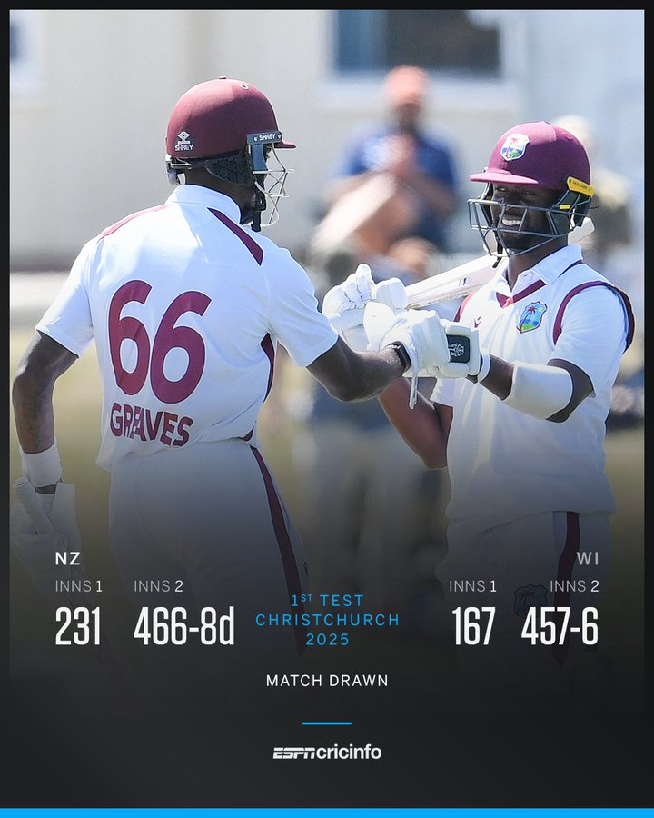 ક્રાઈસ્ટચર્ચમાં આજે ટેસ્ટ ડ્રોમાં જતાં મૅન ઑફ ધ મૅચ જસ્ટિન ગ્રીવ્ઝ (388 બૉલમાં 202 અણનમ), શાઈ હોપ (234 બૉલમાં 140 રન) અને કીમાર રૉચ (233 બૉલમાં 58 અણનમ)ની ઇનિંગ્સ પાણીમાં ગઈ હતી. ગ્રીવ્ઝ-રૉચ વચ્ચે 180 રનની અતૂટ ભાગીદારી થઈ હતી.