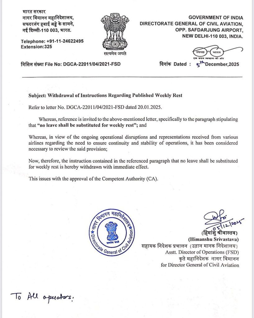 DGCAએ ક્રૂ મેમ્બર્સ માટે દર અઠવાડિયે આરામ(Weekly rest) અંગેના તમામ ફ્લાઈટ ઓપરેટરોને આપેલા નિર્દેશો પાછા ખેંચી લીધા છે.
