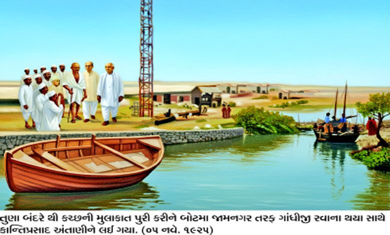 ગાંધીજીની સો વર્ષ પૂર્વેની પ્રથમ અને અંતિમ કચ્છ યાત્રા અનોખી હતી. તા. 22 ઓક્ટોબર સવારે દસેક વાગ્યે ગાંધીજી તેમના સાથીઓ મહાદેવભાઈ, સરદાર વલ્લભભાઈ, મણિભાઈ કોઠારી, આશર પરિવાર વગેરે સાથે માંડવી બંદરે ઊતર્યા. મહાદેવભાઇ એ પ્રસંગ વર્ણવતા લખે છે કે અમારો સંઘ ભૂંડાભૂખ દેખાતા માંડવી બંદર વચ્ચે, રસ્તામાં દ્વારકાધીશનાં દર્શન કરી અને દ્વારકા નગરીના નાગરિકોના અભિનંદન લઈ, 22મી સવારે ઉતર્યો. આગબોટમાંથી દરબારી લોન્ચમાં, લોન્ચમાંથી મછવામાં અને મછવામાંથી બળદગાડામાં અમે કિનારે આવ્યા. ત્યારે માંડવીની બહેનોએ ગરબા ગઈને ગાંધીજીનું સ્વાગત કર્યું. શબ્દો હતા: ભલે આવ્યા સાધુડા!