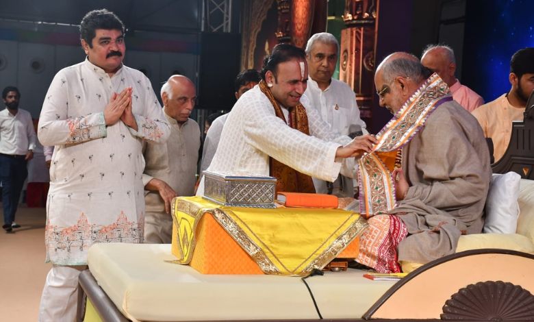 માતૃભાષા ભાગવત સપ્તાહ માટે ખાસ પધારેલા વૈષ્ણવ હૃદય સમ્રાટ વૈષ્ણવાચાર્યશ્રી 108 યદુનાથજી મહોદયશ્રી (કડી - અમદાવાદ)ને માર્ગદર્શન કરવા મુંબઈ સમાચારના તંત્રી નીલેશ દવેએ વિનંતી કરી હતી. યદુનાથજીનું અભિવાદન કરીને નીલેશ દવે, મુખ્ય મનોરથી પરિવાર, સહ મનોરથી પરિવાર સહિત અન્ય મહાનુભાવોએ આશીર્વાદ પ્રાપ્ત કર્યા હતા.